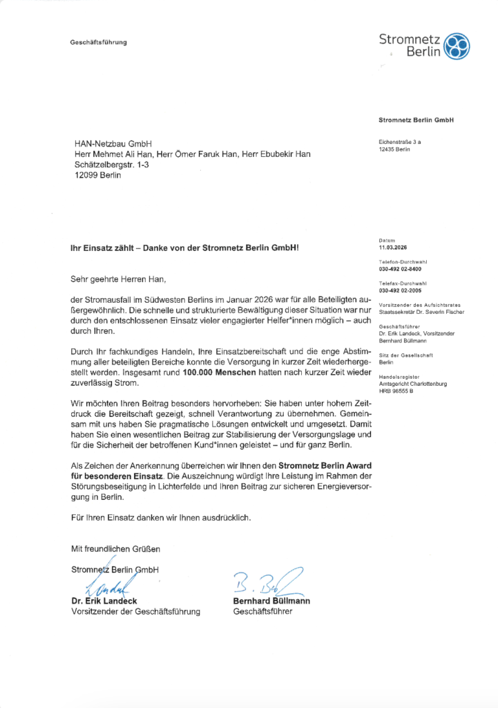 Dank höchster Professionalität, effizienter Koordination und schneller Umsetzung konnten die Arbeiten nicht nur erfolgreich, sondern auch in bemerkenswert kurzer Zeit abgeschlossen werden. Für diese herausragende Leistung wurde HAN Netzbau zu Recht ausgezeichnet – ein starkes Zeichen für Verlässlichkeit, Kompetenz und Einsatzbereitschaft im Dienst der Stadt Berlin.